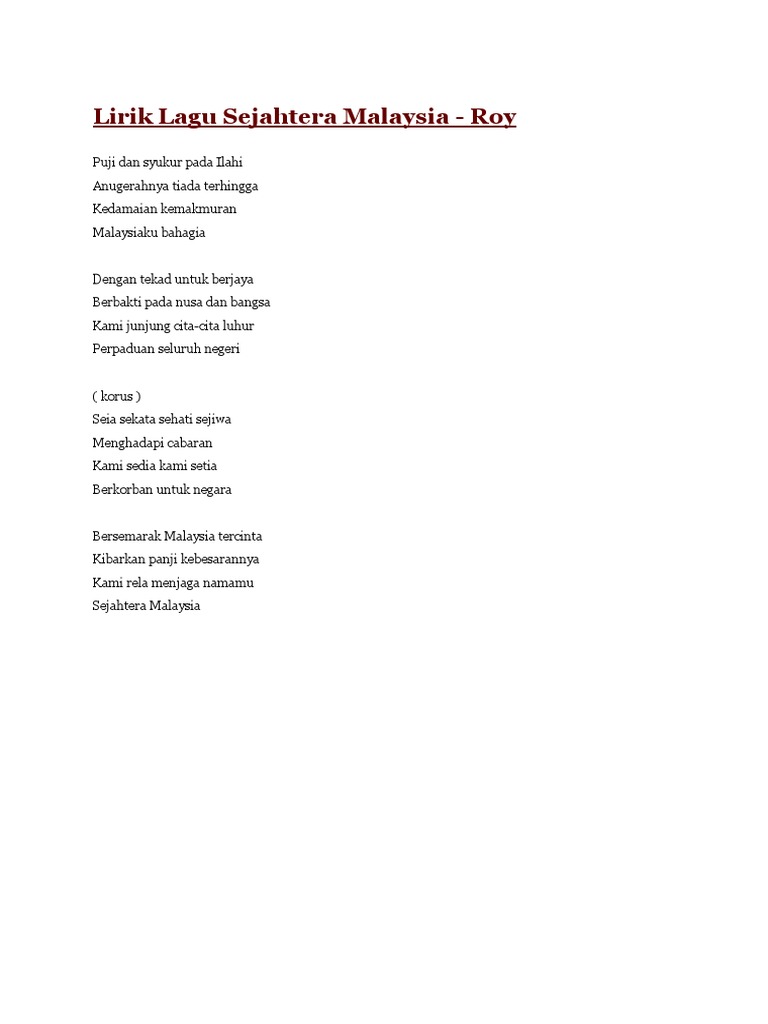 Puji dan syukur pada Ilahi Anugerahnya tiada terhingga Kedamaian kemakmuran Malaysiaku bahagia. Lirik Lagu Sejahtera Malaysia Lagu Patriotik Lirik Lagu Sejahtera Malaysia. Kekasih yang dulu hilang.